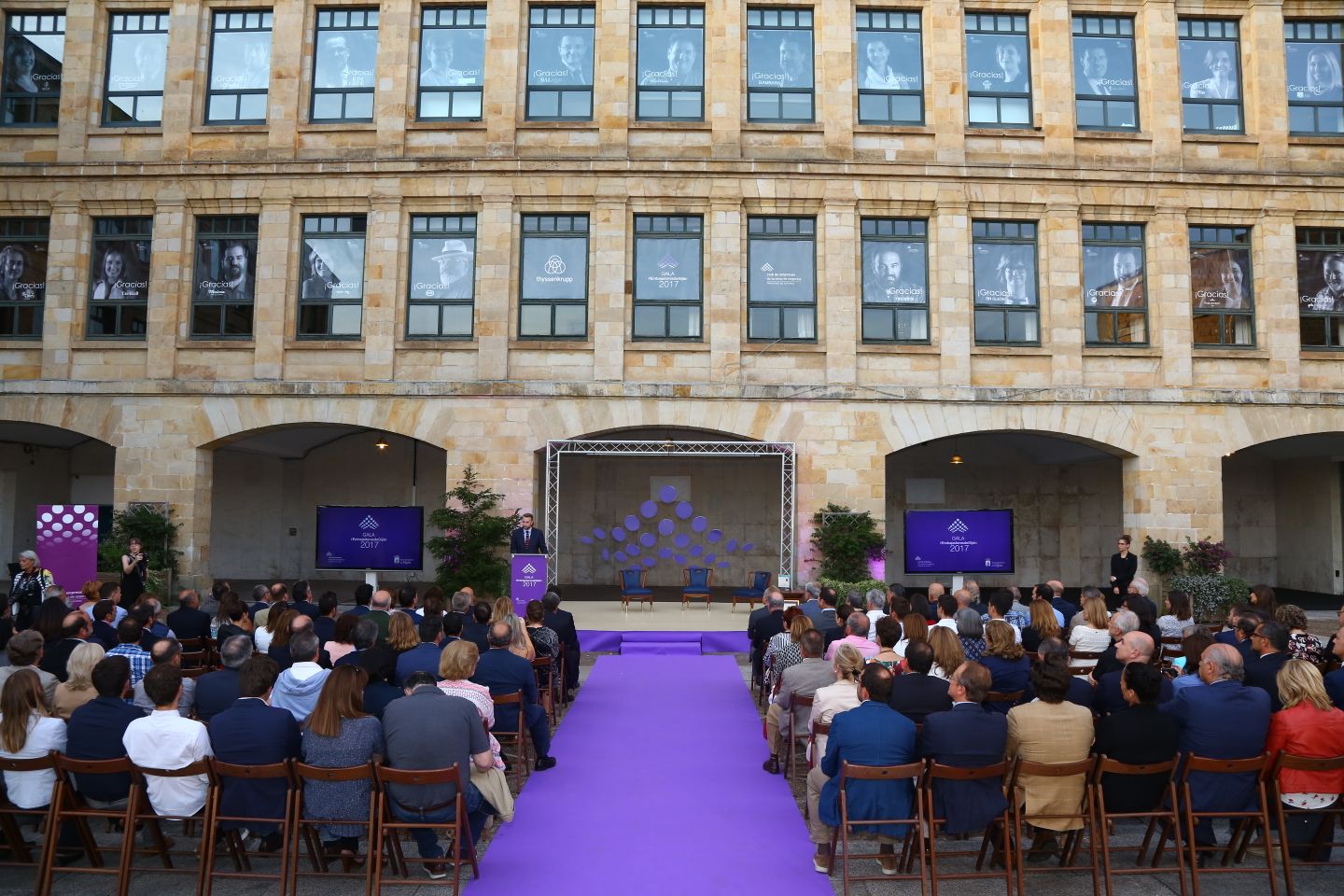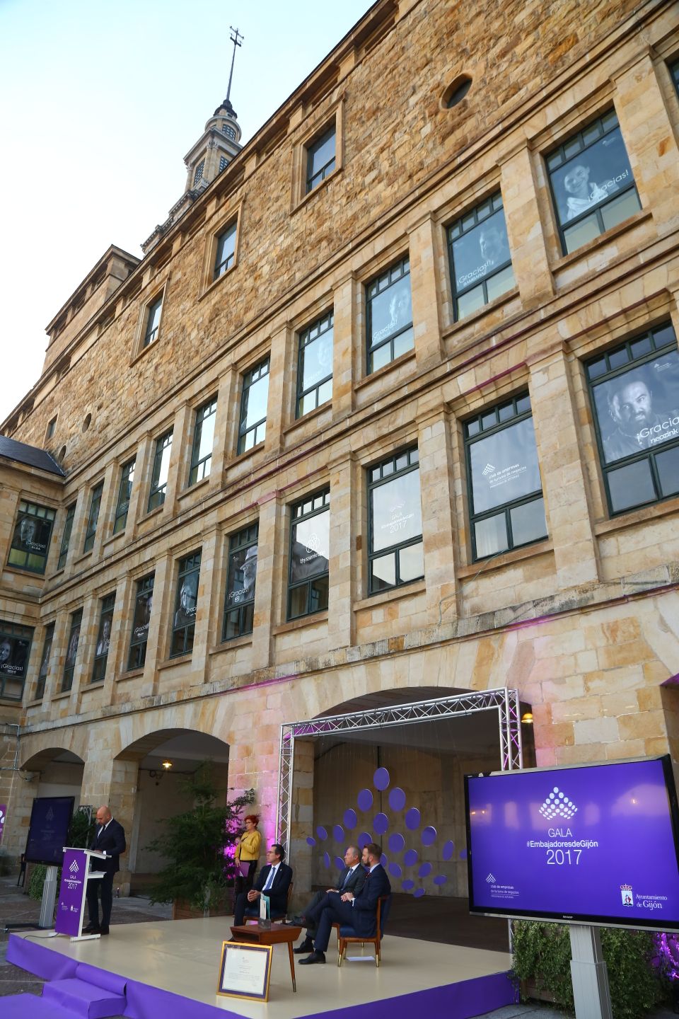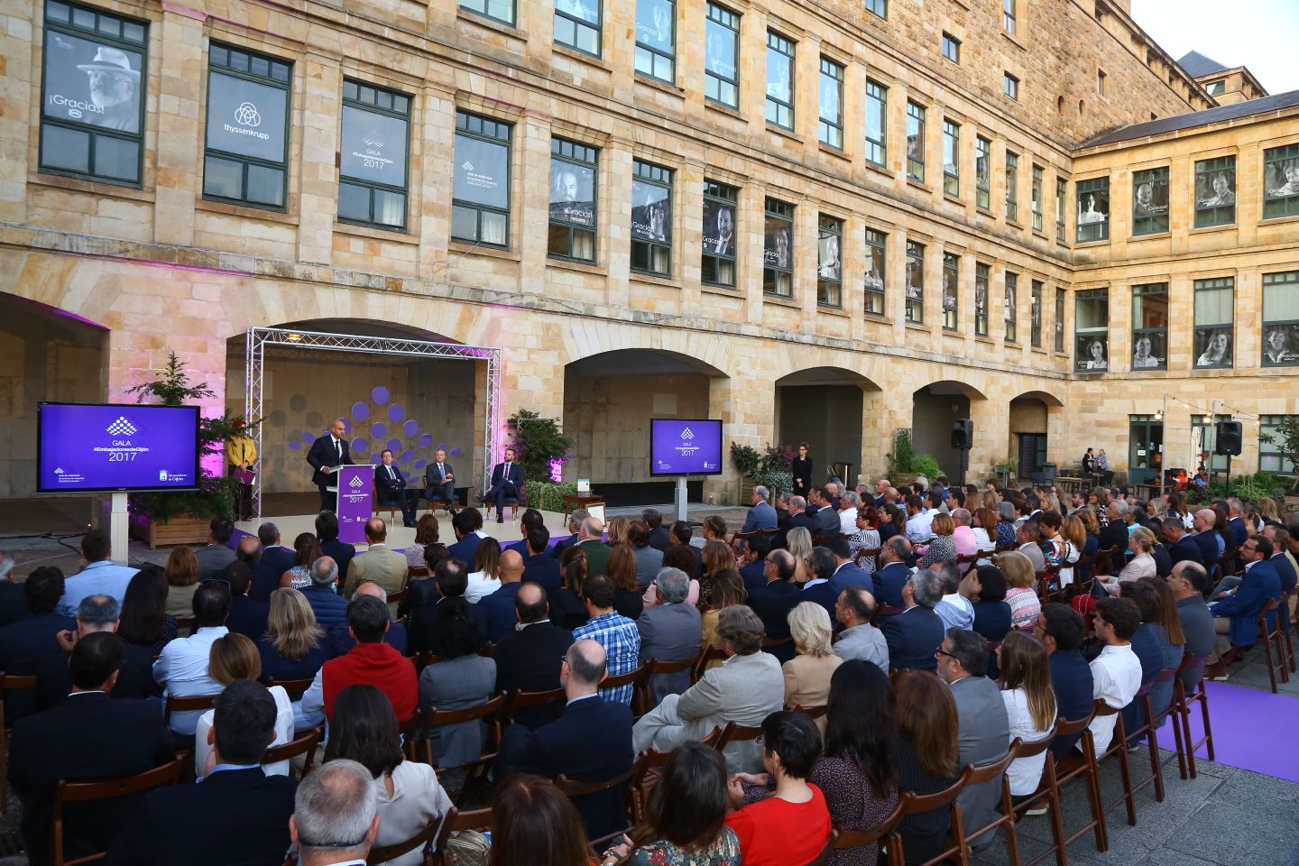 La Gala Embajadores de Gijón 2017 tuvo como escenario el patio Dórico de Laboral Ciudad de la Cultura. Organizado por la Agencia de Eventos y Comunicación Bittia, el acto, con la participación de alumnos del Conservatorio de Música y Danza de Gijón, contó con el servicio de azafatas de la empresa Eurolang y catering servido por Balbona. Todos los proveedores, incluidos Alquisa – Alquiler de equipos audiovisuales y Foto Vídeo Perlines, encargado del reportaje de imagen, son empresas miembro del Gijón Convention Bureau.